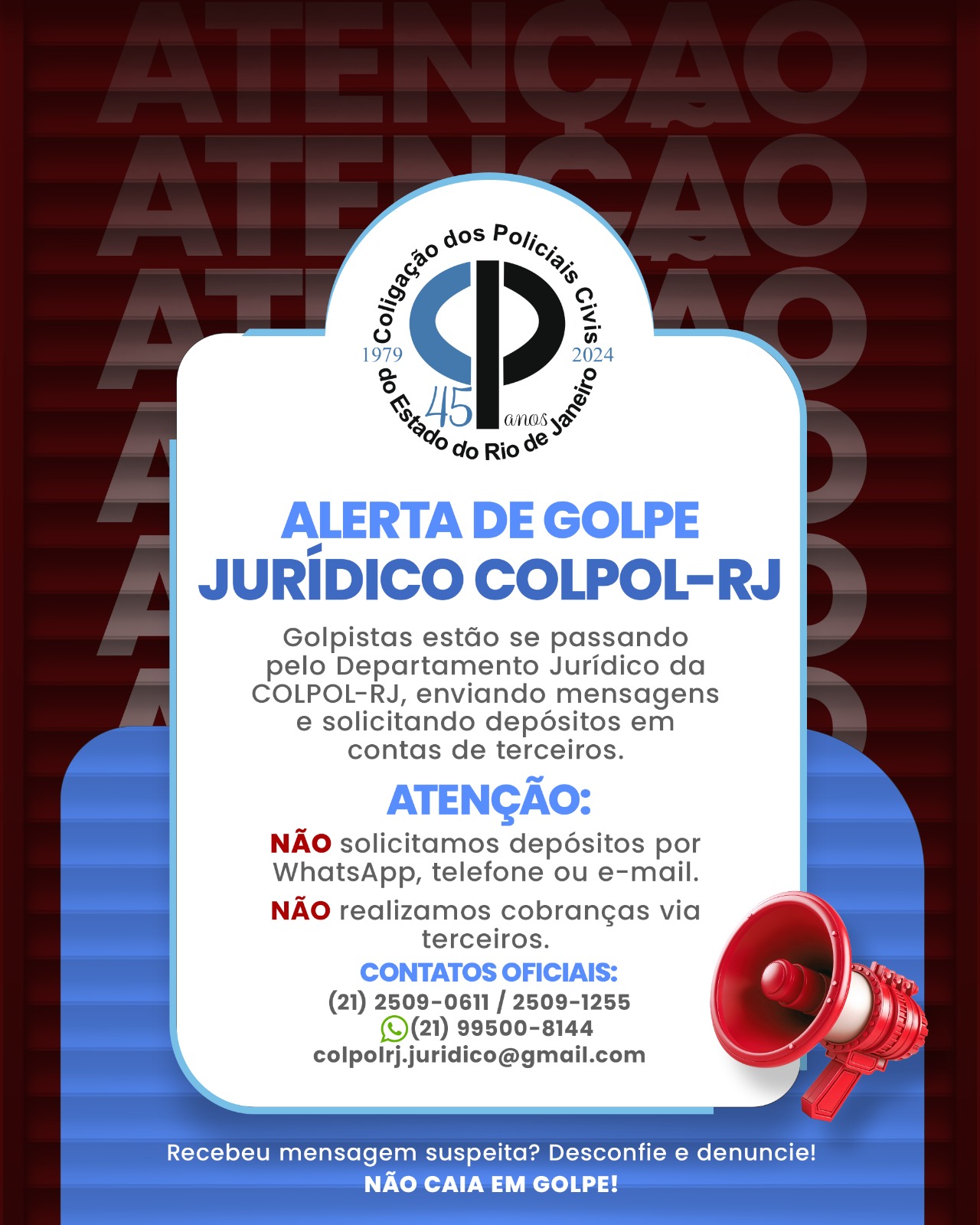 REITERAMOS: O Departamento Jurídico da COLPOL-RJ NÃO solicita depósitos, transferências ou qualquer tipo de pagamento via telefone, e-mail ou WhatsApp, muito menos em contas de terceiros.