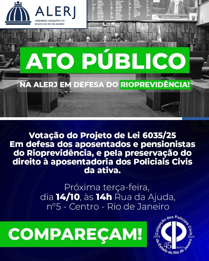 Convidamos todos os Policiais Civis a participarem do ATO PÚBLICO EM DEFESA DAS APOSENTADORIAS E PENSÕES DO RIOPREVIDÊNCIA.