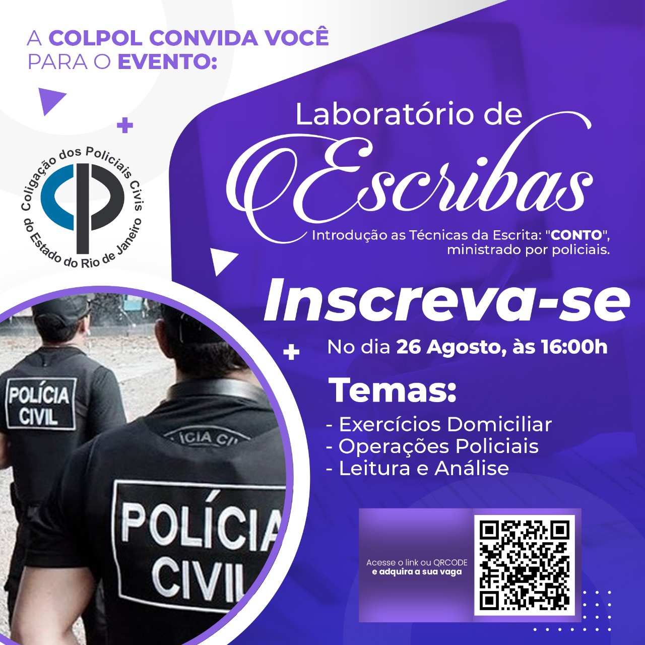 A COLPOL, entidade de notória atuação em defesa da classe policial do estado e do país CONVIDA todo efetivo e público externo para participar do projeto “LABORATÓRIO DE ESCRIBAS”, que visa a introdução de técnicas de escrita aos participantes, na modalidade “CONTO”, ministrado por policiais escritores.