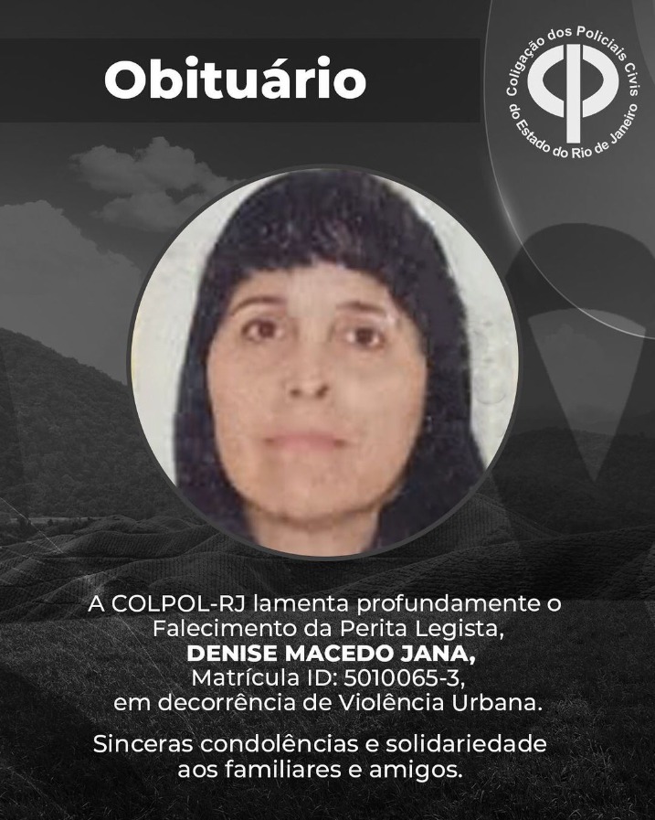 A COLPOL-RJ, informa com pesar o falecimento da PERITA LEGISTA, DENISE MACEDO JANA, ocorrido hoje no dia 19/04/2023 em decorrência de Violência Urbana.