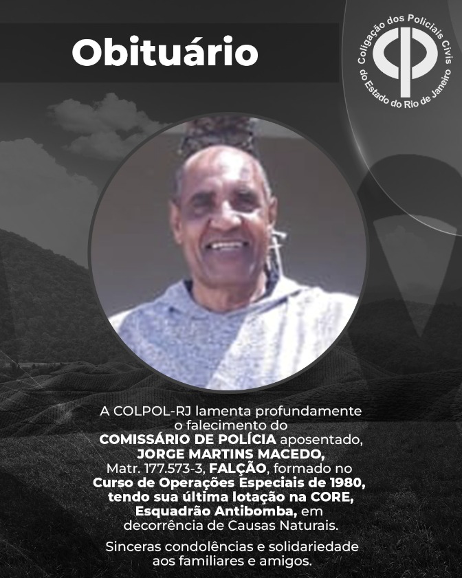 A COLPOL-RJ lamenta profundamente o falecimento do COMISSÁRIO DE POLÍCIA aposentado, JORGE MARTINS MACEDO, Matr. 177.573-3, Falcão formado no Curso de Operações Especiais de 1980, tendo sua última lotação na CORE, Esquadrão Antibomba, em decorrência de Causas Naturais.
