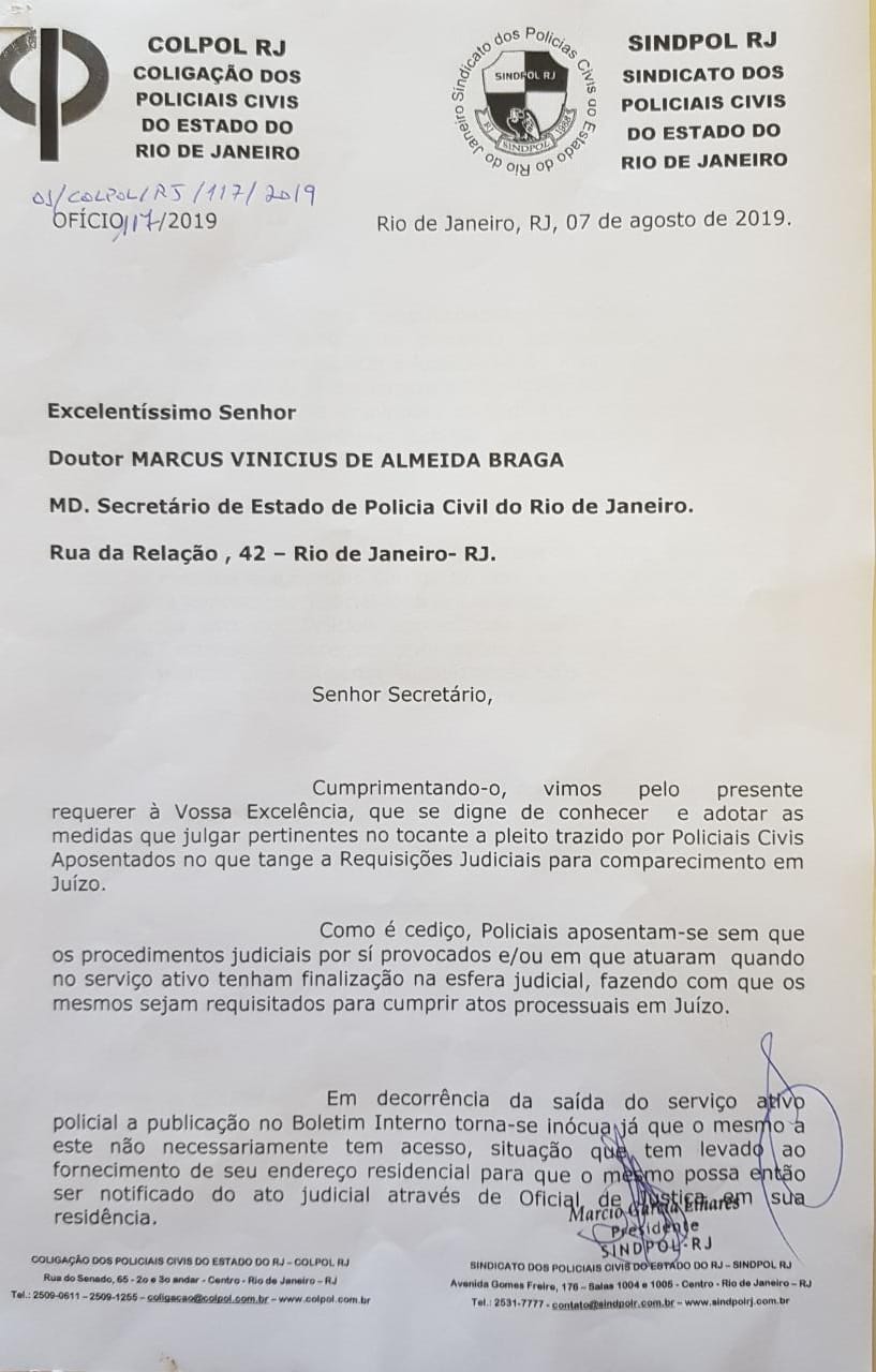 Nesta 4ª feira, 07/08, a COLPOL-RJ e o SINDPOL-RJ enviaram um ofício ao Secretário de