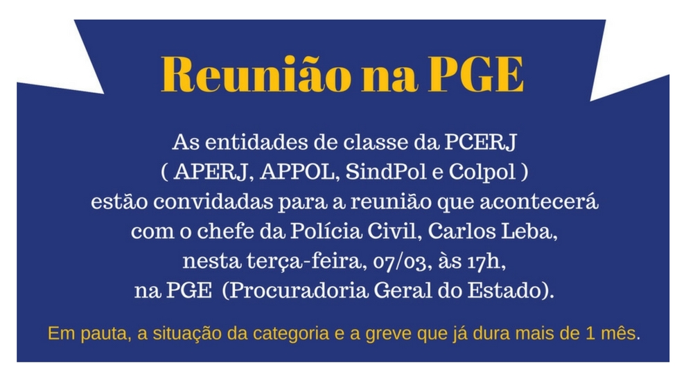 Reunião na Procuradoria Geral do Estado As entidades de classe da PCERJ – APERJ, APPOL, SindPol e Colpol -, estão convidadas para a reunião Leia Mais >>