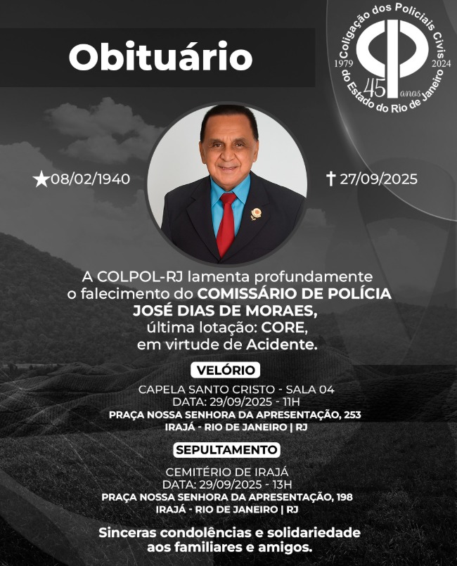 A COLPOL-RJ lamenta profundamente o falecimento do COMISSÁRIO DE POLÍCIA JOSÉ DIAS DE MORAES, última