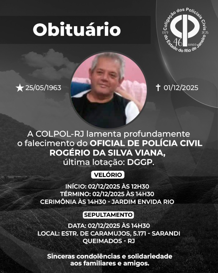 A COLPOL-RJ lamenta profundamente o falecimento do OFICIAL DE POLÍCIA CIVIL ROGÉRIO DA SILVA VIANA,