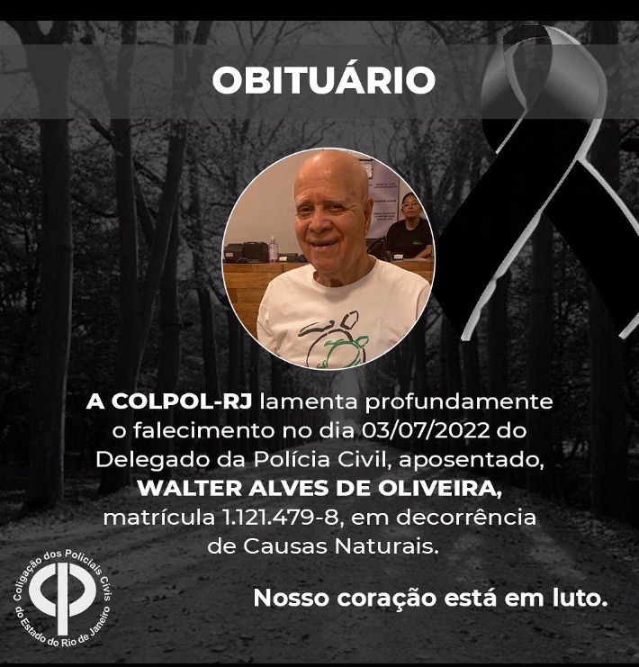 A COLPOL-RJ lamenta profundamente o falecimento no dia 03/07/2022 do Delegado da Polícia Civil, aposentado,