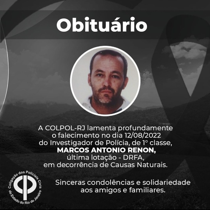 A COLPOL-RJ lamenta profundamente o Falecimento no dia 12/08/2022 do Investigador de Polícia, de 1°