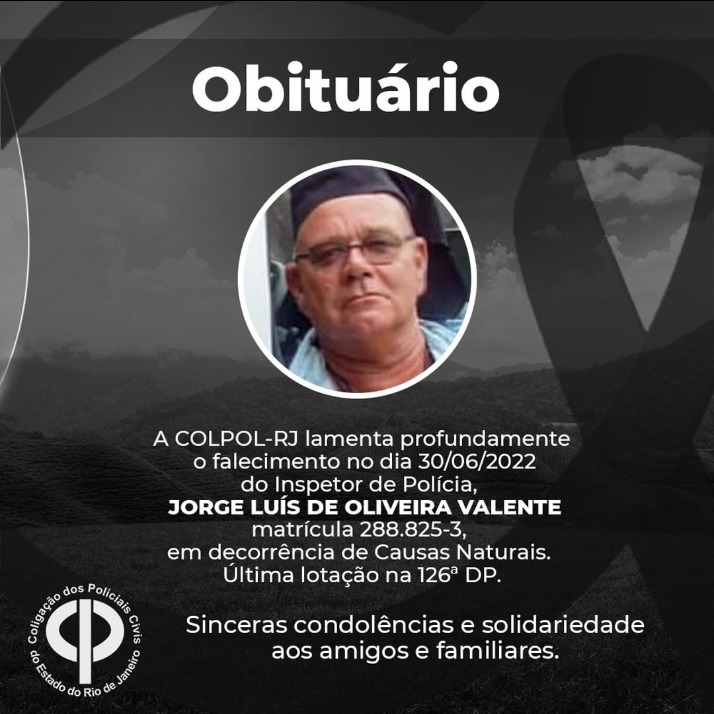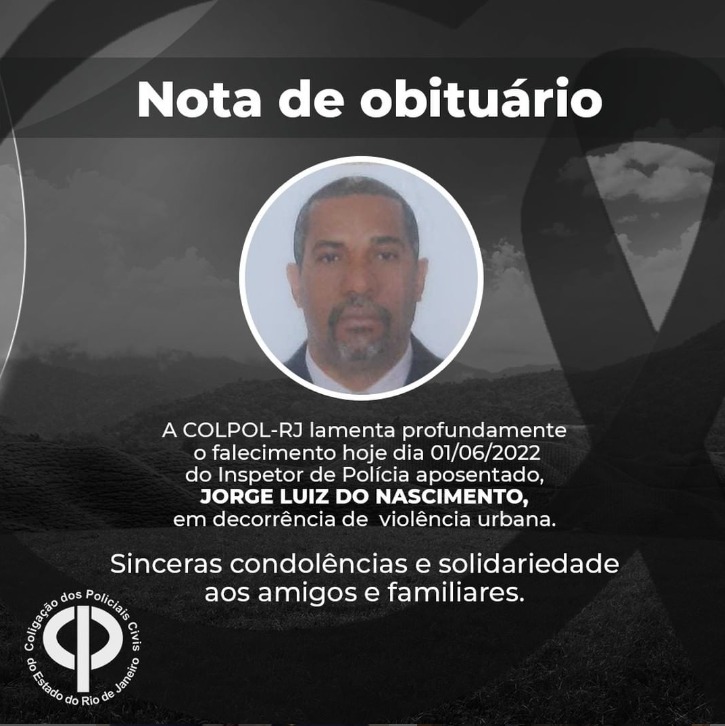 A COLPOL-RJ lamenta profundamente o falecimento no dia 30/06/2022 do Inspetor de Polícia, JORGE LUÍS