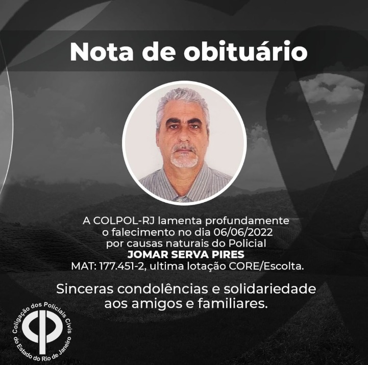 A COLPOL-RJ lamenta profundamente o falecimento no dia 06/06/2022 por causas naturais do Policial JOMAR