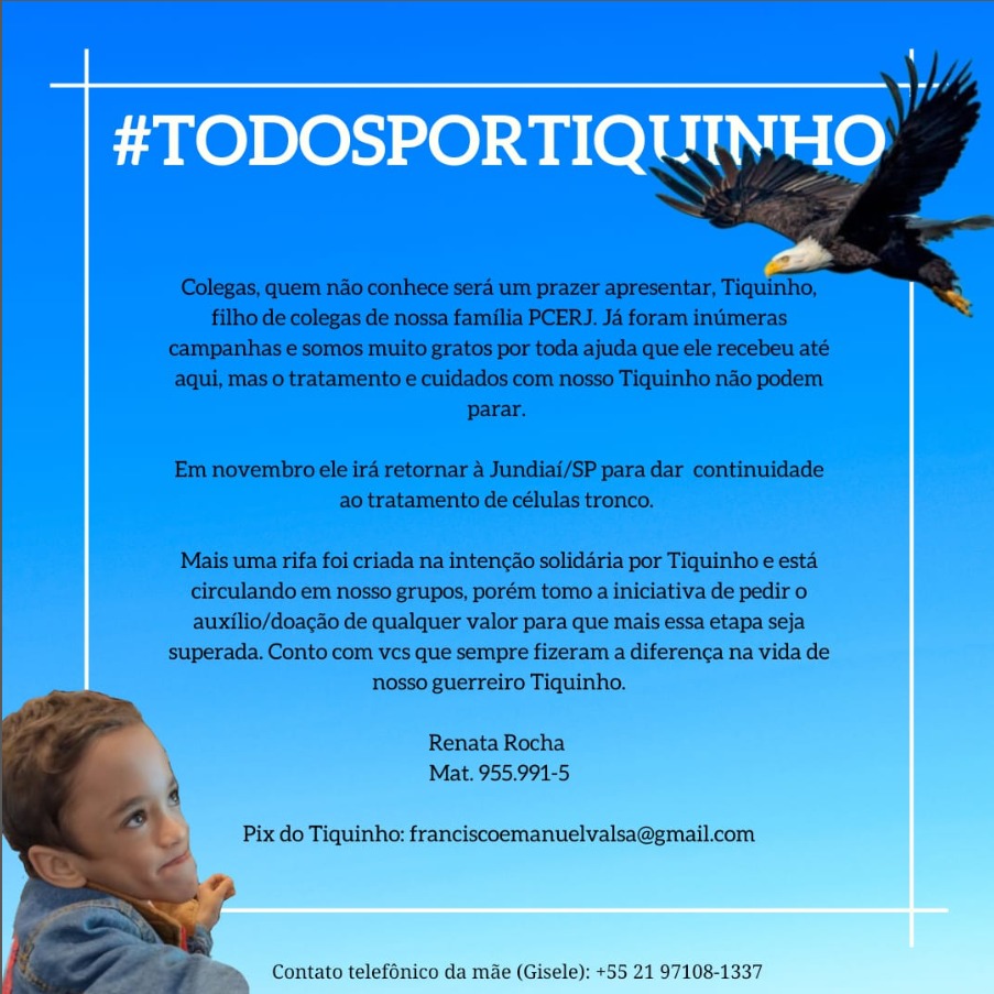 Colegas, quem não conhece será um prazer apresentar, Tiquinho, filho de colegas de nossa família PCERJ. Já foram inúmeras campanhas e somos muito gratos por toda ajuda que ele recebeu até aqui, mas o tratamento e cuidados com nosso Tiquinho não podem parar.