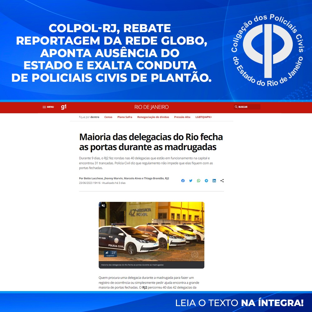 A Coligação dos Policiais Civis do Estado do Rio de Janeiro, COLPOL-RJ, Associação que atua há 43 anos initerruptamente em defesa da categoria Policial Civil, não poderia deixar de se manifestar acerca da matéria divulgada pela Rede Globo que abordou a falta de policiais nos plantões das delegacias distritais do Rio de Janeiro.