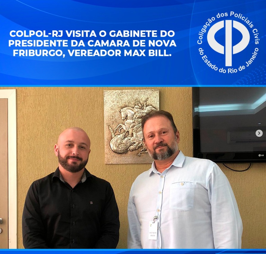 COLPOL-RJ, representada pelo Presidente Fábio Neira e o Diretor de Interesse de classe, Comissário Márcio Garcia, em mais uma visita para prestigiar o Presidente da Câmara de Nova Friburgo, Vereador Max Bill, para Reunião sobre assuntos relacionados a categoria dos Policiais Civis.