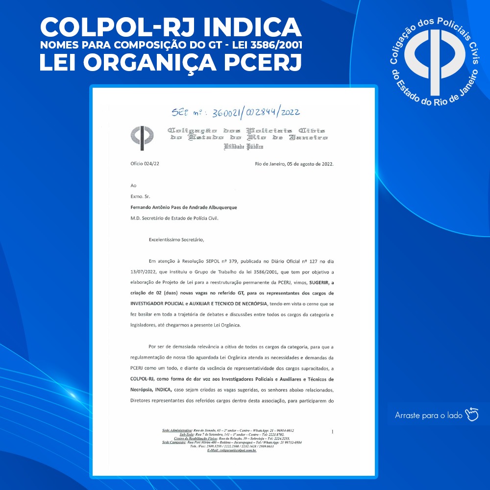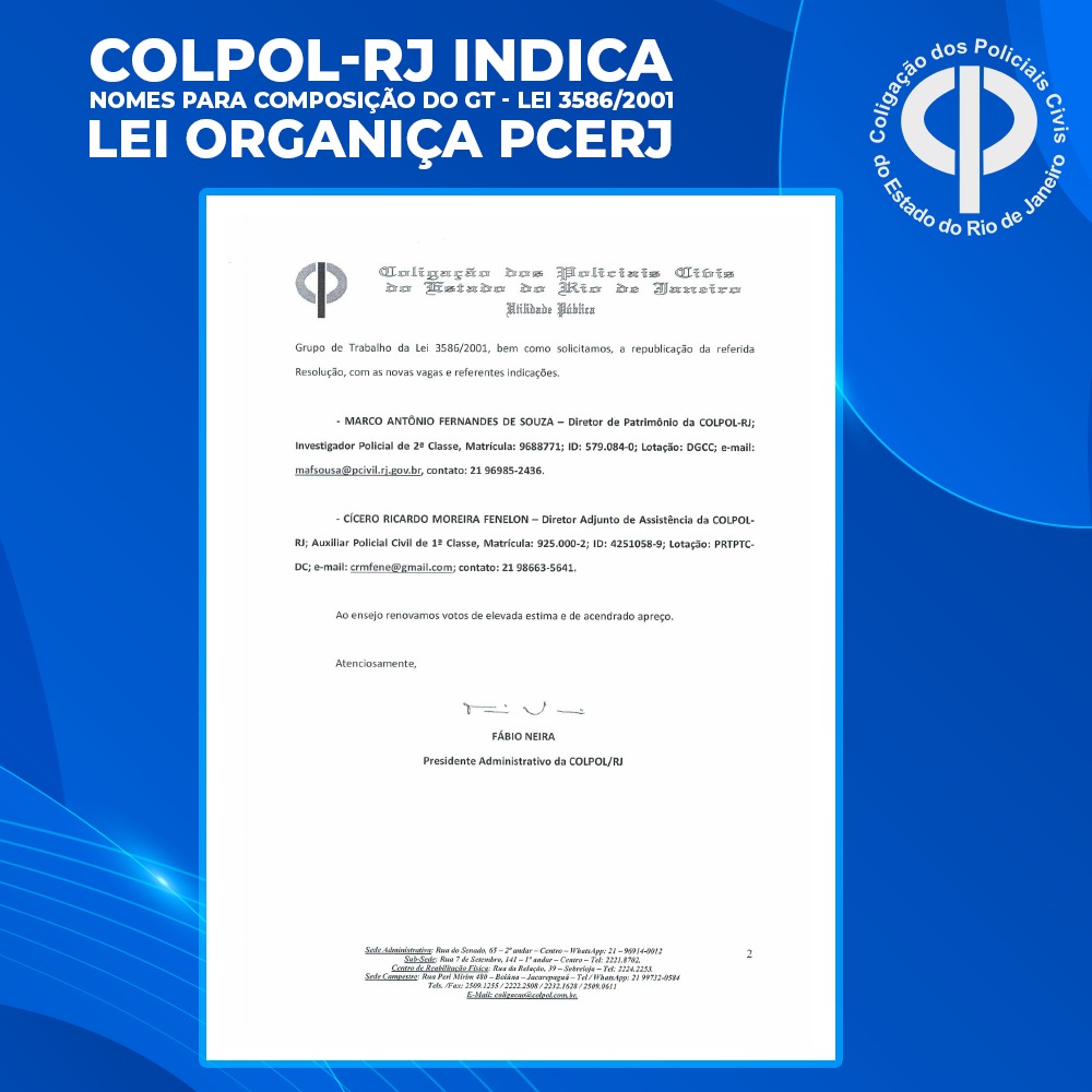 COLPOL_RJ, faz indicação para criação de 02 VAGAS NO GRUPO DE TRABALHO (GT) da Lei 3586/2001 e indica nomes para compor o quadro.