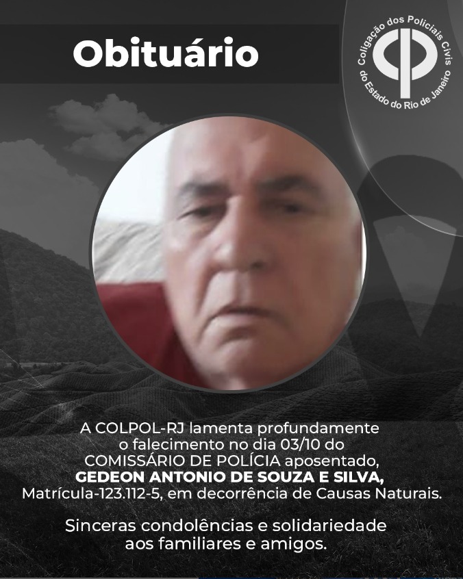 A COLPOL-RJ lamenta profundamente o falecimento no dia 03/10 do COMISSÁRIO DE POLÍCIA aposentado, GEDEON ANTONIO DE SOUZA E SILVA, Matrícula-123.112-5, em decorrência de Causas Naturais.