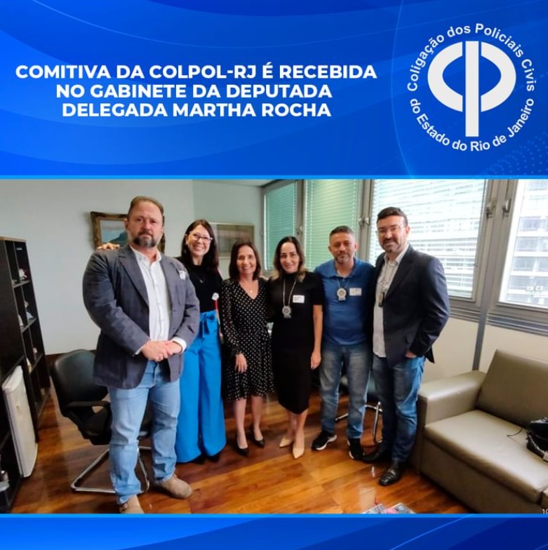 A COLPOL-RJ, na data de 11/05/2023, representada por seu Presidente Fabio Neira e parte de sua diretoria: a Diretora do Departamento de Acompanhamento Legislativo, Perita Papiloscopista Alessandra Korenchendler; da Diretora Adjunta do Departamento de Acompanhamento Legislativo Perita Papiloscopista Alessandra Siffert; do Diretor Adjunto do Departamento de Assistência Auxiliar Policial de Necropsia Cícero Fenelon e, do Técnico Policial de Necropsia Leonardo Menezez, onde foram recebidos em comitiva no gabinete da Deputada Delegada Martha Rocha, para tratar de assuntos atinentes à regulamentação da Lei Orgânica da Polícia Civil, em especial sobre a tão esperada reestruturação e modernização do quadro funcional da PCERJ.