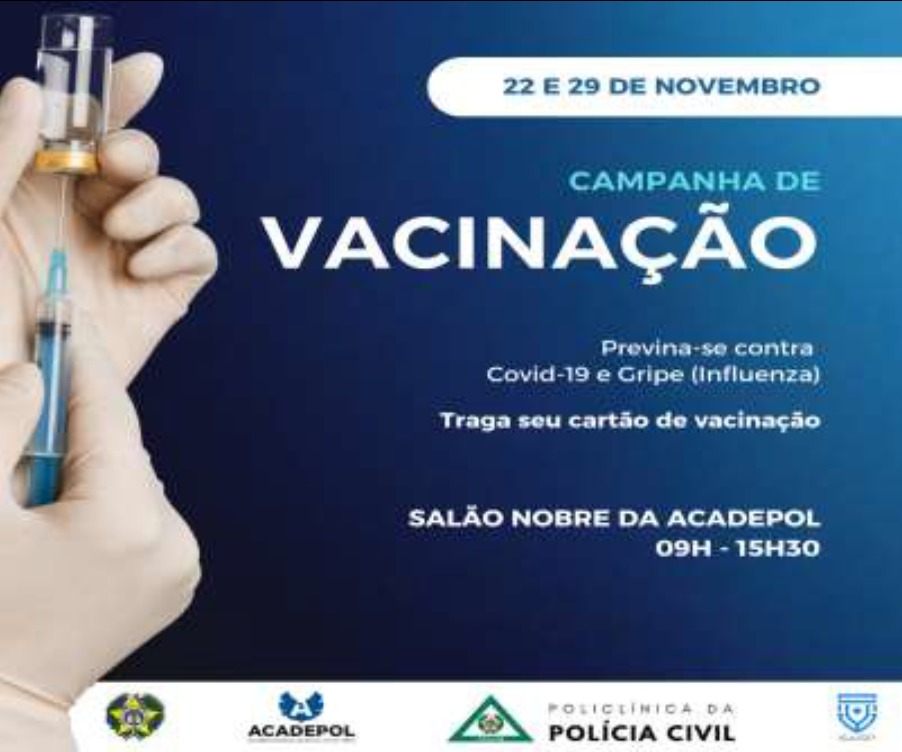 contra Covid-19 (vacina bivalente) e Gripe (Influenza) que será realizada pelo Serviço de Atenção à Saúde do Policial (SASP) nos dias 22 e 29 de novembro de 2023 entre 09h e 15h30 no Salão Nobre da ACADEPOL.