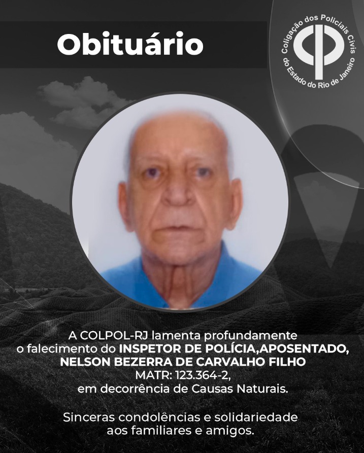 A COLPOL-RJ lamenta profundamente o falecimento do INSPETOR DE POLÍCIA, aposentando, NELSON BEZERRA DE CARVALHO FILHO, MATR: 123.364-2, em decorrência de Causas Naturais.