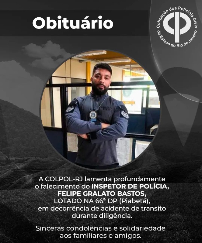 A COLPOL-RJ lamenta profundamente o falecimento do INSPETOR DE POLÍCIA, FELIPE GRALATO BASTOS, lotado na 66ª DP (Piabetá), em decorrência de acidente de trânsito durante diligência.