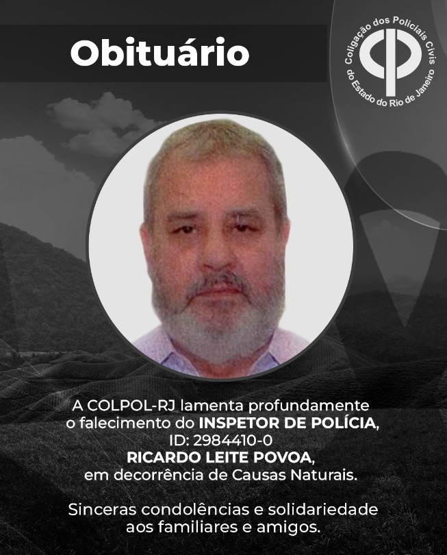 A COLPOL-RJ lamenta profundamente o falecimento do INSPETOR DE POLÍCIA, RICARDO LEITE POVOA, ID: 2984410-0, em decorrência de Causas Naturais.
