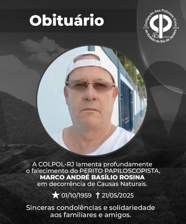 A COLPOL-RJ lamenta profundamente o falecimento do PERITO PAPILOSCOPISTA MARCO ANDRÉ BASÍLIO ROSINA, em decorrência de Causas Naturais.