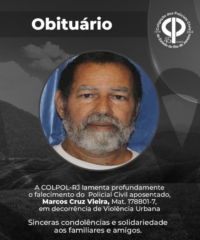 A COLPOL-RJ lamenta profundamente o falecimento do POLICIAL CIVIL, aposentado, MARCOS CRUZ VIEIRA, MATR: 178801-7, em decorrência de Violência Urbana.