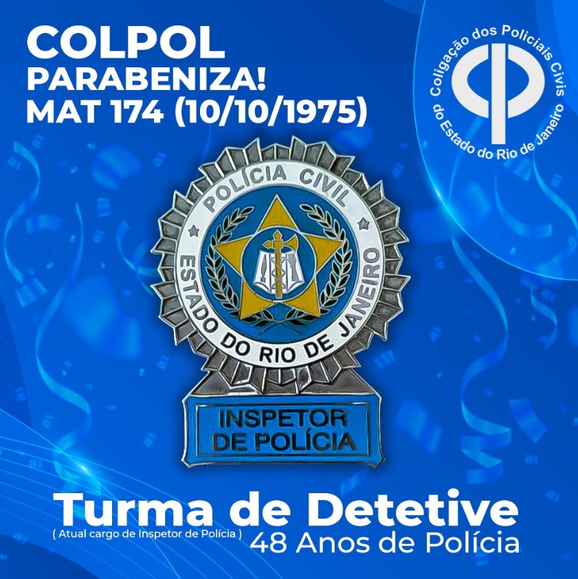 A COLPOL-RJ, parabeniza a todos os DETETIVES DE POLÍCIA pela comemoração de 48 anos de Polícia e reitera seu total apoio aos colegas de categoria.