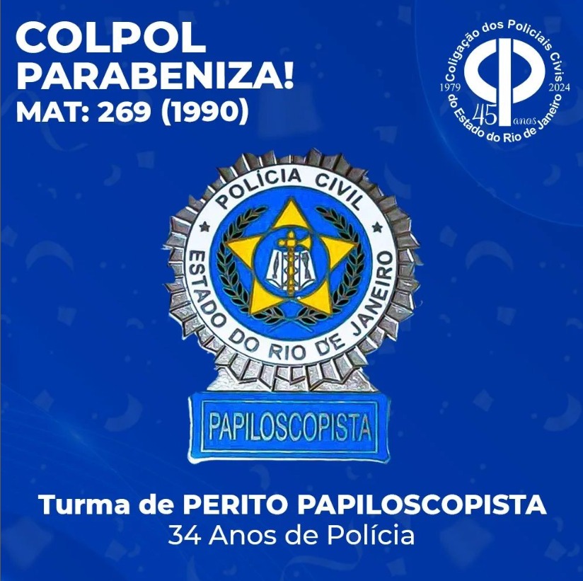A COLPOL-RJ, parabeniza a todos os PERITOS PAPILOSCOPISTAS pela comemoração de 34 anos de Polícia e reitera seu total apoio aos colegas de categoria.