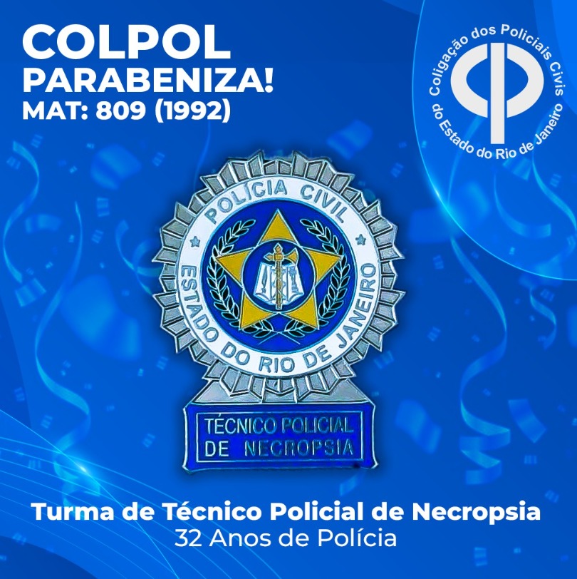 A COLPOL-RJ, parabeniza a todos os TÉCNICOS POLICIAIS DE NECROPSIA pela comemoração de 32 anos de Polícia e reitera seu total apoio aos colegas de categoria.
