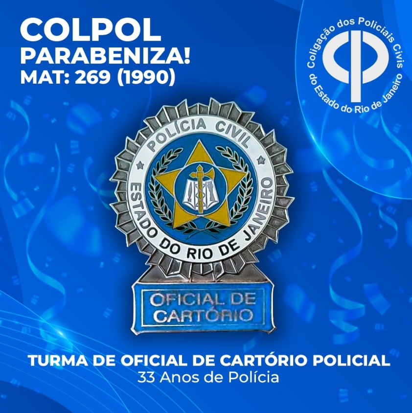 A COLPOL-RJ, parabeniza a todos os OFICIAIS DE CARTÓRIO POLICIAL pela comemoração de 33 anos de Polícia e reitera seu total apoio aos colegas de categoria.