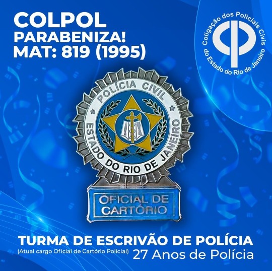 A COLPOL, parabeniza todos os ESCRIVÃES DE POLÍCIA (Atual cargo Oficial de Cartório Policial) pela comemoração de 27 anos de Polícia e reitera seu total apoio aos colegas da categoria.