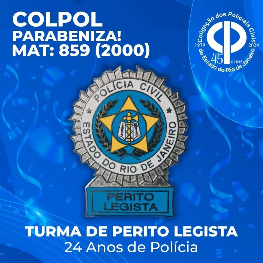 A COLPOL-RJ, parabeniza a todos os PERITOS LEGISTAS pela comemoração de 24 anos de Polícia e reitera seu total apoio aos colegas de categoria.