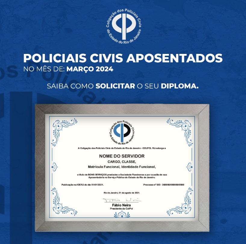 A COLPOL-RJ tem a honra de estender aos nobres colegas Policiais Civis aposentados no mês de Março do ano de 2024, o Diploma em agradecimento pelo compromisso prestado à sociedade Fluminense e a Polícia Civil do Estado do Rio de Janeiro.