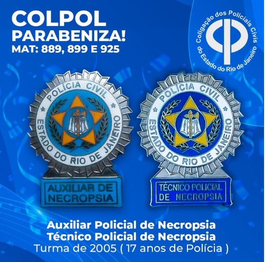 A COLPOL-RJ, parabeniza a todos os AUXILIARES POLICIAIS DE NECROPSIA e TÉCNICOS POLICIAIS DE NECROPSIA pela comemoração de 17 anos de polícia e reitera seu total apoio aos colegas da categoria.