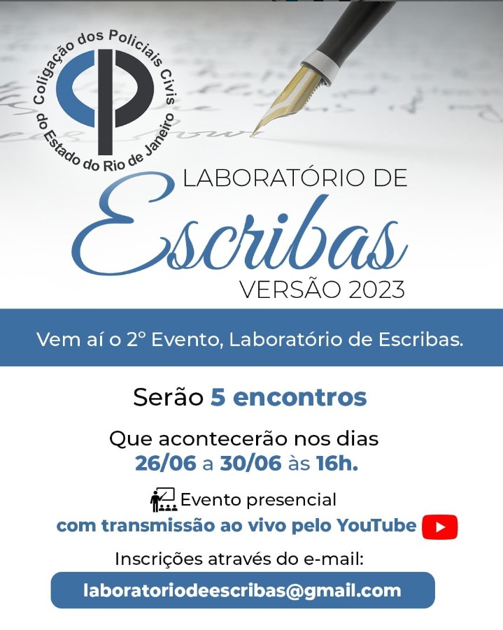 A COLPOL, entidade de notória atuação em defesa da classe policial do estado e do país, CONVIDA todo efetivo e público externo a se empenhar no projeto “Laboratório de Escribas” versão 2023, introduzindo aos participantes técnicas da escrita – na modalidade “CONTO e CRÔNICA”, ministrado por policiais escritores. Nesta segunda edição, reconstruiremos o gênero policial à atualidade brasileira e mundial; integrando policiais com a população.