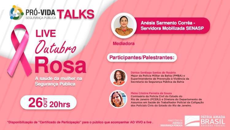 Na próxima terça-feira (26), às 20hs, será realizada mais uma live do projeto “Pró-Vida Talks”. A temática será: “Outubro Rosa – A saúde da mulher na Segurança Pública”. A iniciativa da realização de lives faz parte do Programa Nacional de Qualidade de Vida para Profissionais de Segurança Pública (Pró-Vida). As convidadas serão: