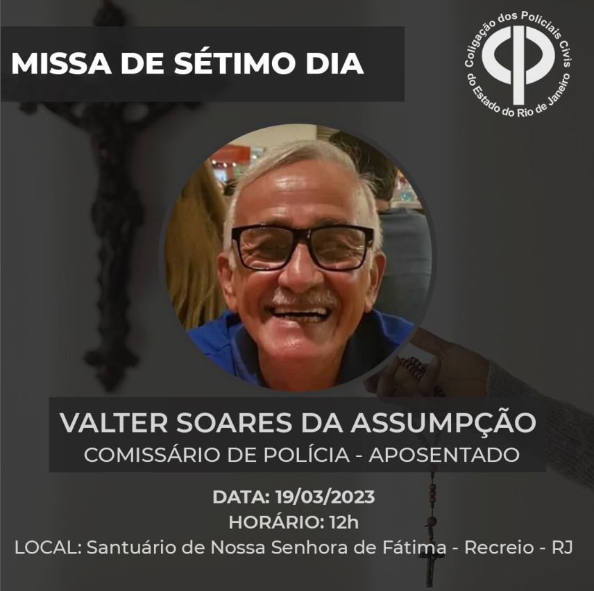 A COLPOL-RJ, informa a MISSA DE SÉTIMO DIA do Comissário de Polícia Aposentado VALTER SOARES DA ASSUMPÇÃO.