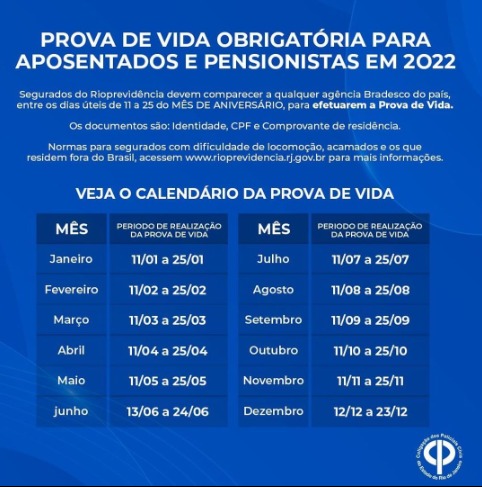 O RIOPREVIDÊNCIA está realizando no mês de NOVEMBRO de 2022 A Prova de Vida OBRIGATÓRIA para os Aposentados e Pensionistas, entre os dias úteis de 11 a 25 do mês de aniversário, para que seu benefício não seja suspenso.