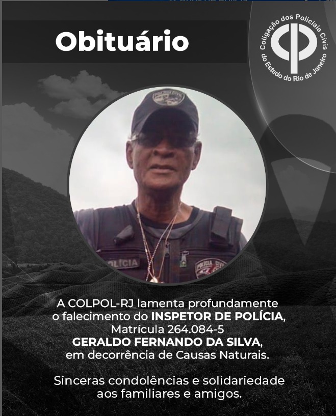 A COLPOL-RJ lamenta profundamente o falecimento do INSPETOR DE POLÍCIA, GERALDO FERNANDO DA SILVA, MAT. 264.084-5, em decorrência de Causas Naturais.
