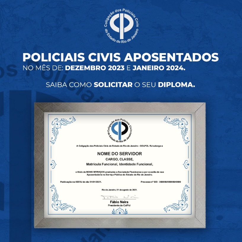 A COLPOL-RJ tem a honra de estender aos nobres colegas Policiais Civis aposentados nos meses de Dezembro do ano de 2023 e Janeiro do ano de 2024, o Diploma em agradecimento pelo compromisso prestado à sociedade Fluminense e a Polícia Civil do Estado do Rio de Janeiro.