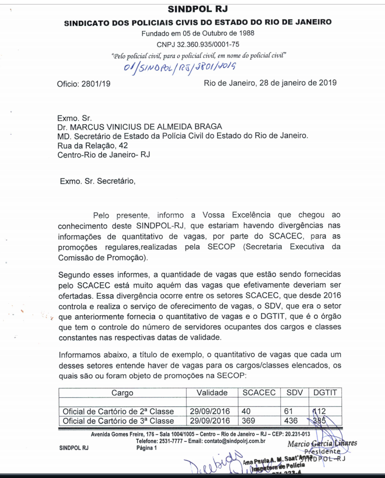 Embora continue em vigência a decisão judicial de segunda instância, em caráter liminar, nos autos da ação do SINDPOL/COLPOL para que as promoções não fossem suspensas, conforme determinado em ofício pelo Secretário de Estado da Casa Civil do Governo Pezão, tais andamentos foram interrompidos desde o final do ano passado, face ao questionamento levantado pelas entidades classistas no início da atual gestão da SEPOL, ainda em Janeiro, demonstrando que o número de vagas atribuídas pela SCACEC/SDV/DGGP estava muito aquém das vagas realmente existentes, conforme estudo comparado com os critérios extraídos e utilizados pelo próprio SDV em tempos passados, bem como das planilhas do DGTIT.