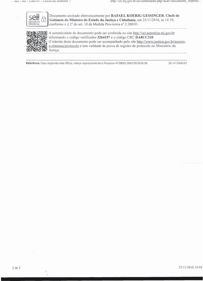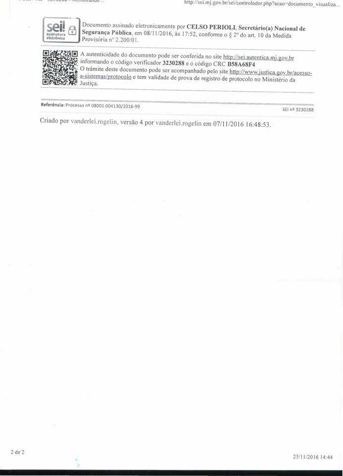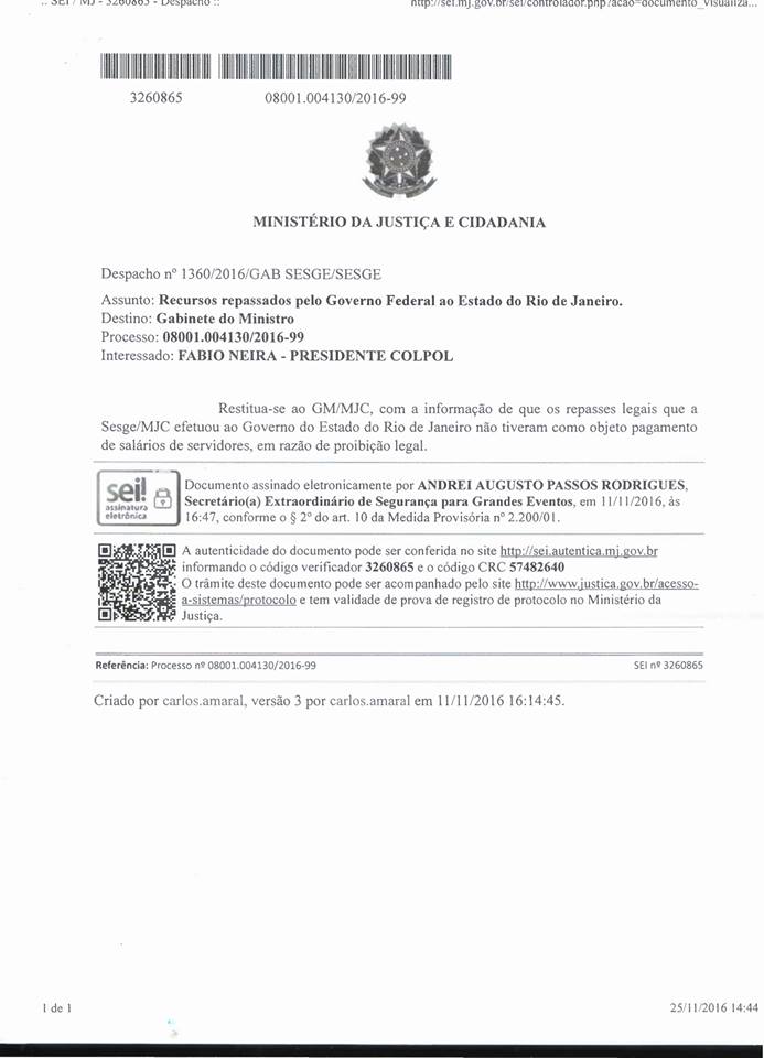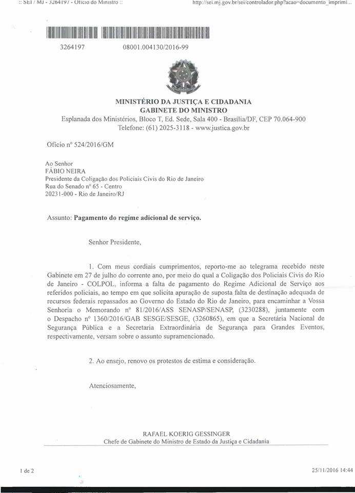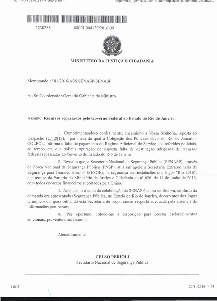 O Ministério da Justiça e Cidadania do Governo Federal respondeu ao ofício da Colpol-RJ, denunciando o não pagamento do RAS OLÍMPICO e PARALÍMPICO, tendo em vista a liberação de 2,9 bilhões de reais, cuja aplicação seria destinada exclusivamente à segurança pública durante a realização dos jogos olímpicos Rio 2016, conforme anunciado pela imprensa e pelo próprio governo à época.